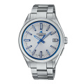 シンプルで洗練された3針フェイスに、青が際立つホワイト蒸着文字板で、外装にはステンレスを採用。フラットベゼルでビジネススタイルにも合わせやすいモデルです。風防は反射防止コーティングサファイアガラスです。