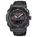 ケースデザインに合わせ、エッジの効いたH駒タイプのチタンバンドを採用。イオンプレーティングでケースと同様にマットブラックに仕上げられています。ステンレススチールに比べ軽量で金属アレルギーを起こしにくいチタンの素材特性により、長時間の着用でも披露を軽減し、汗をかいた時でも快適な装着感をキープ。快適なアウトドア体験をサポートします。中留めにはダブルロック三つ折れ式を採用しています。